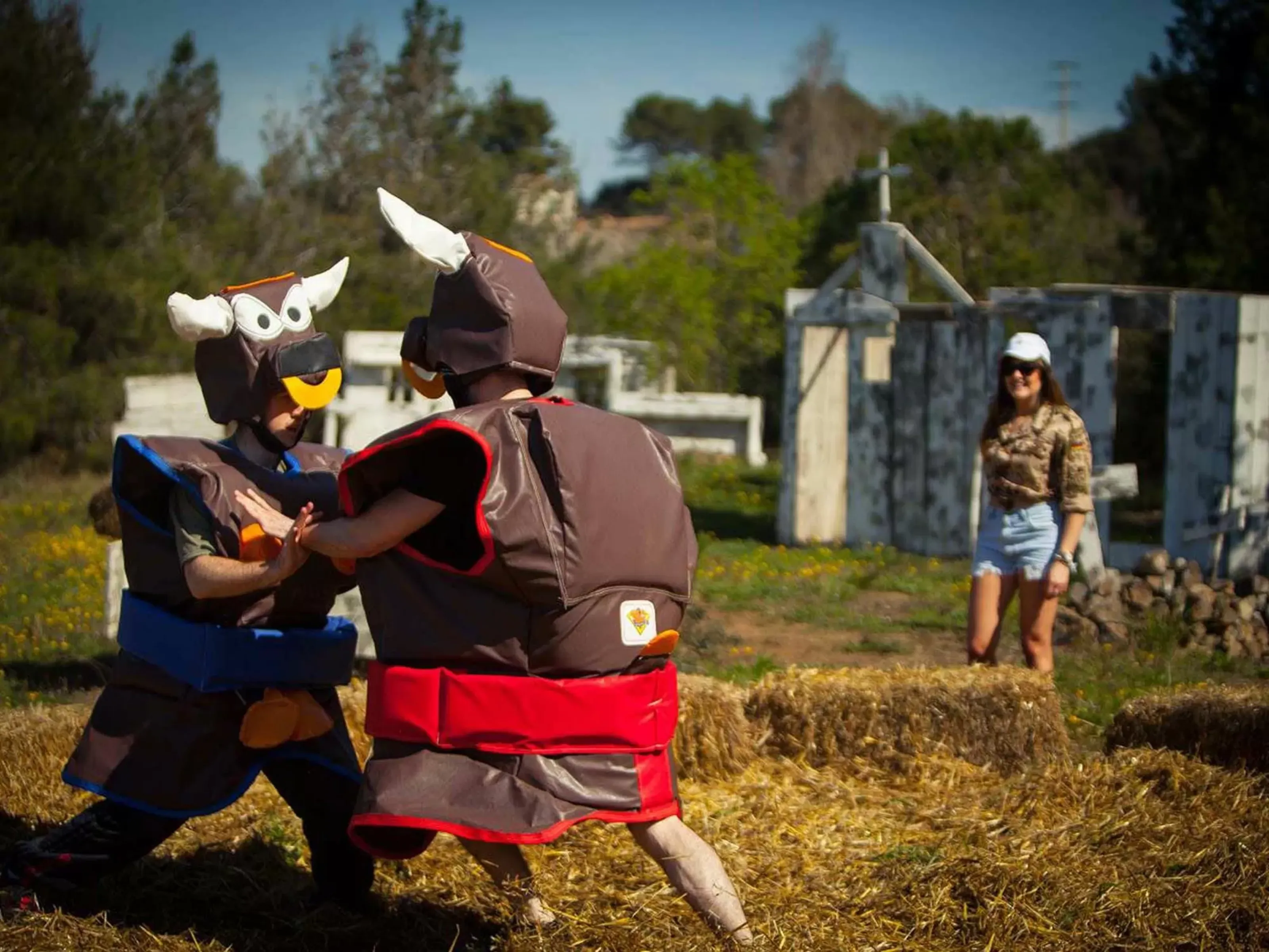 Who has the most aggressive team players? It’s time to find out as one person from each team gets inside of a bull shaped sumo suit. The aim of the game is to push one another out of the hay bales!