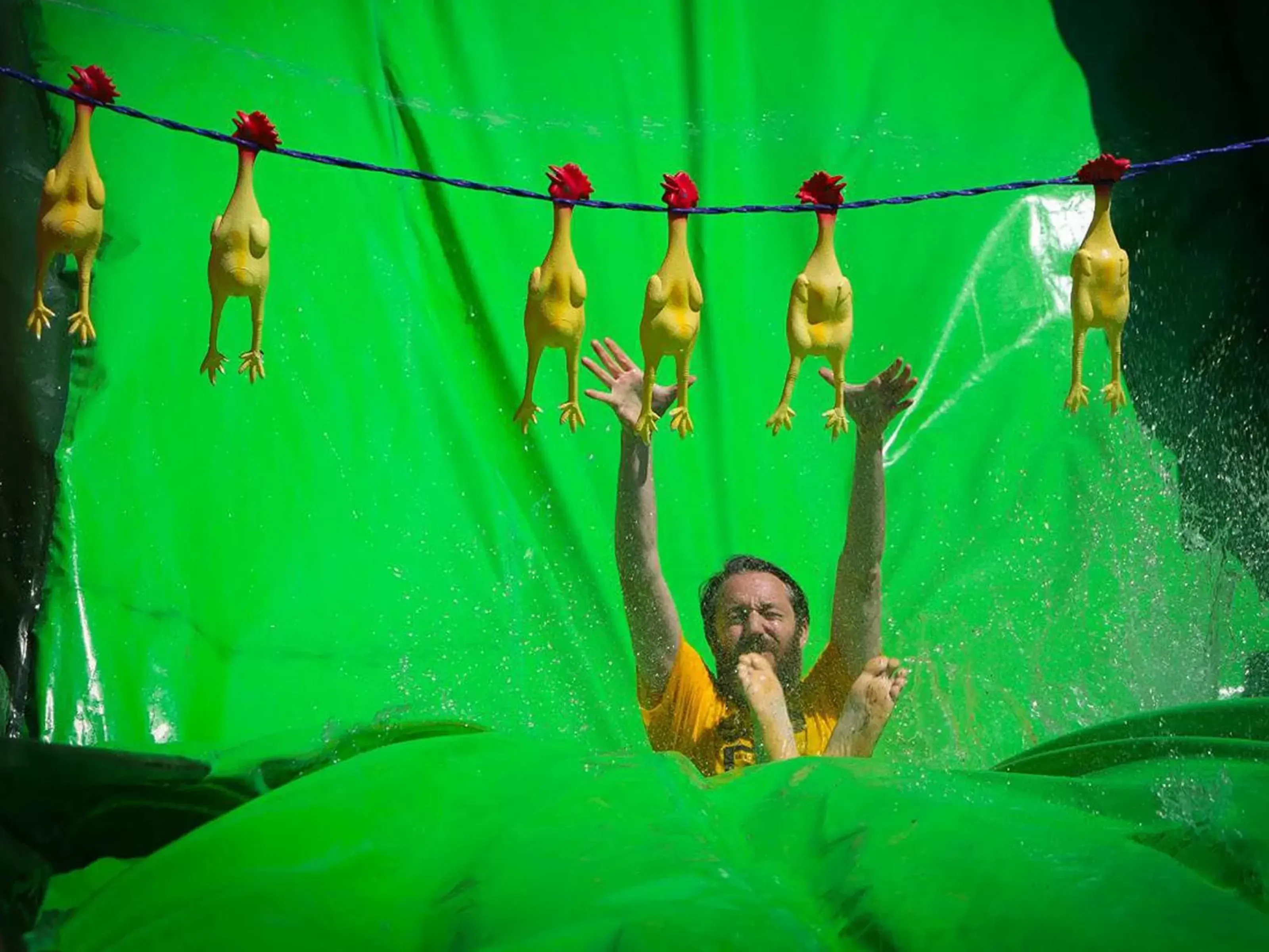 In teams make your way up the huge inflatable slide as quickly as possible and slide yourselves down whilst grabbing as many chickens as you possible can! The local villagers won’t be too pleased.