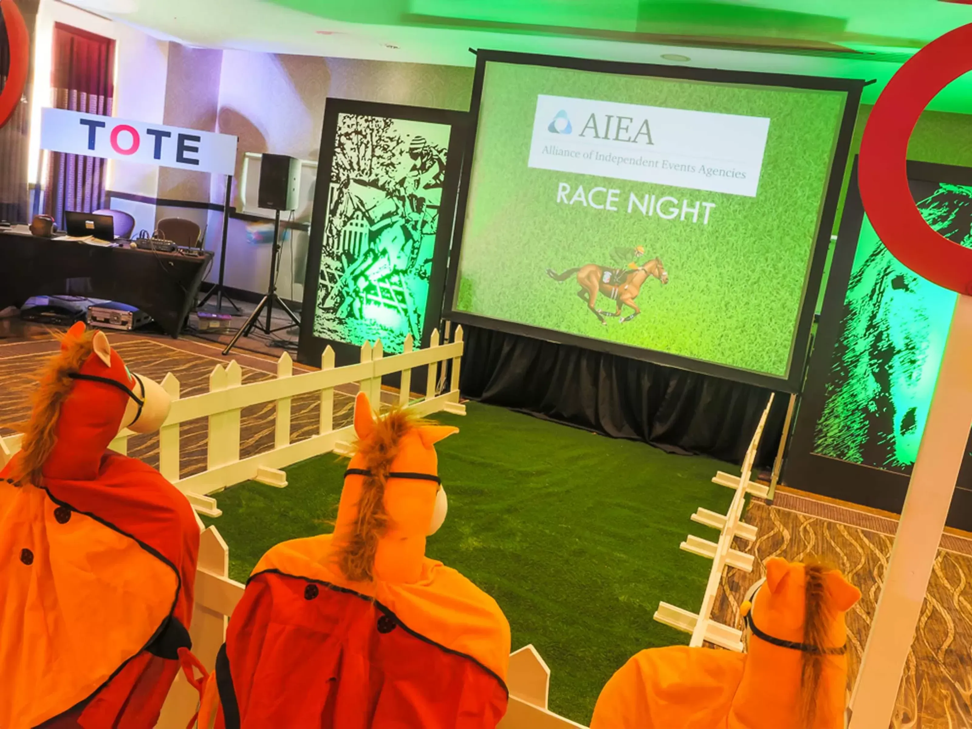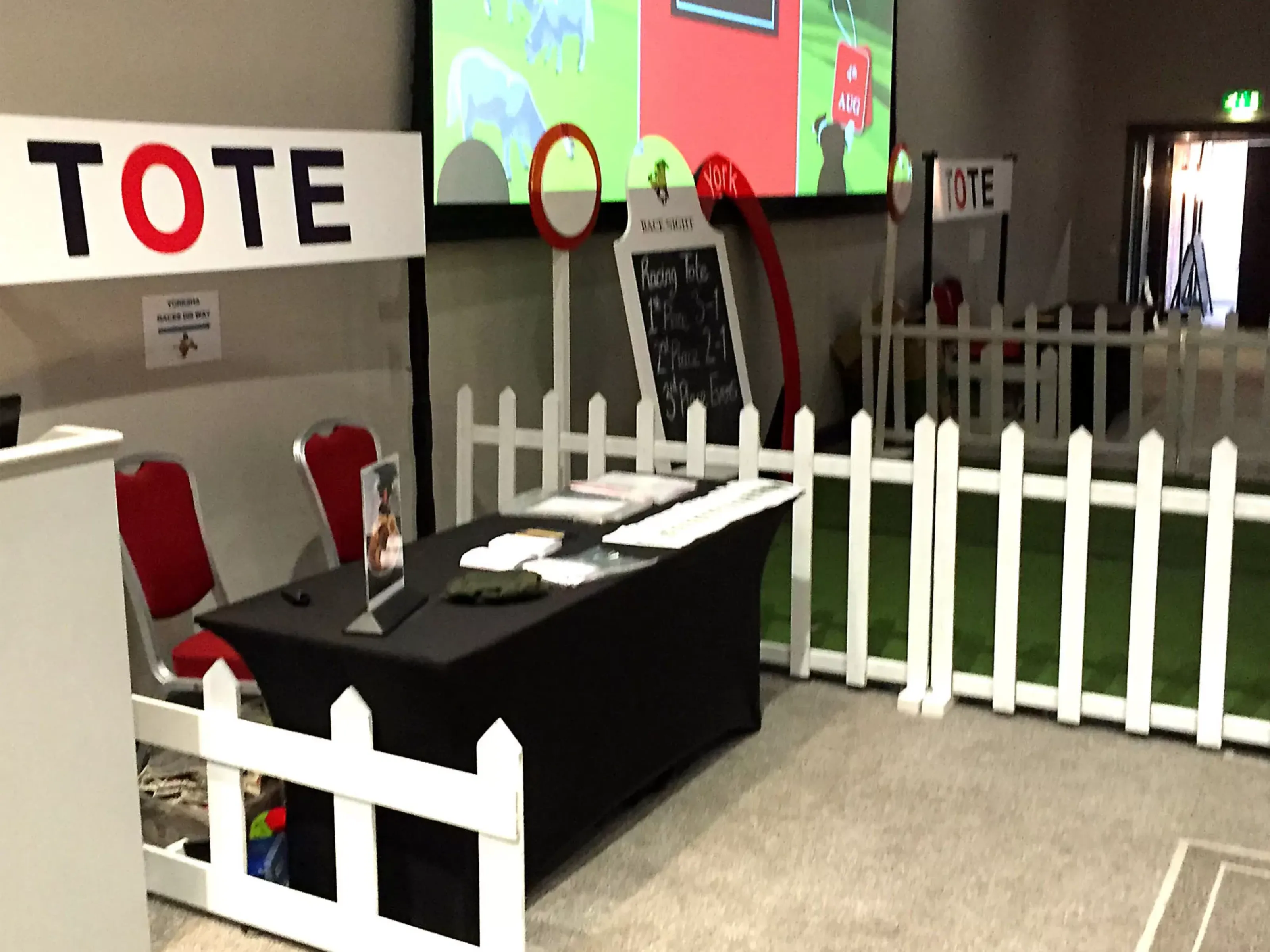 - Includes team betting slips on the tables, race instruction leaflets, PA system, white picket fences, grass area, winning posts, race pull up banners