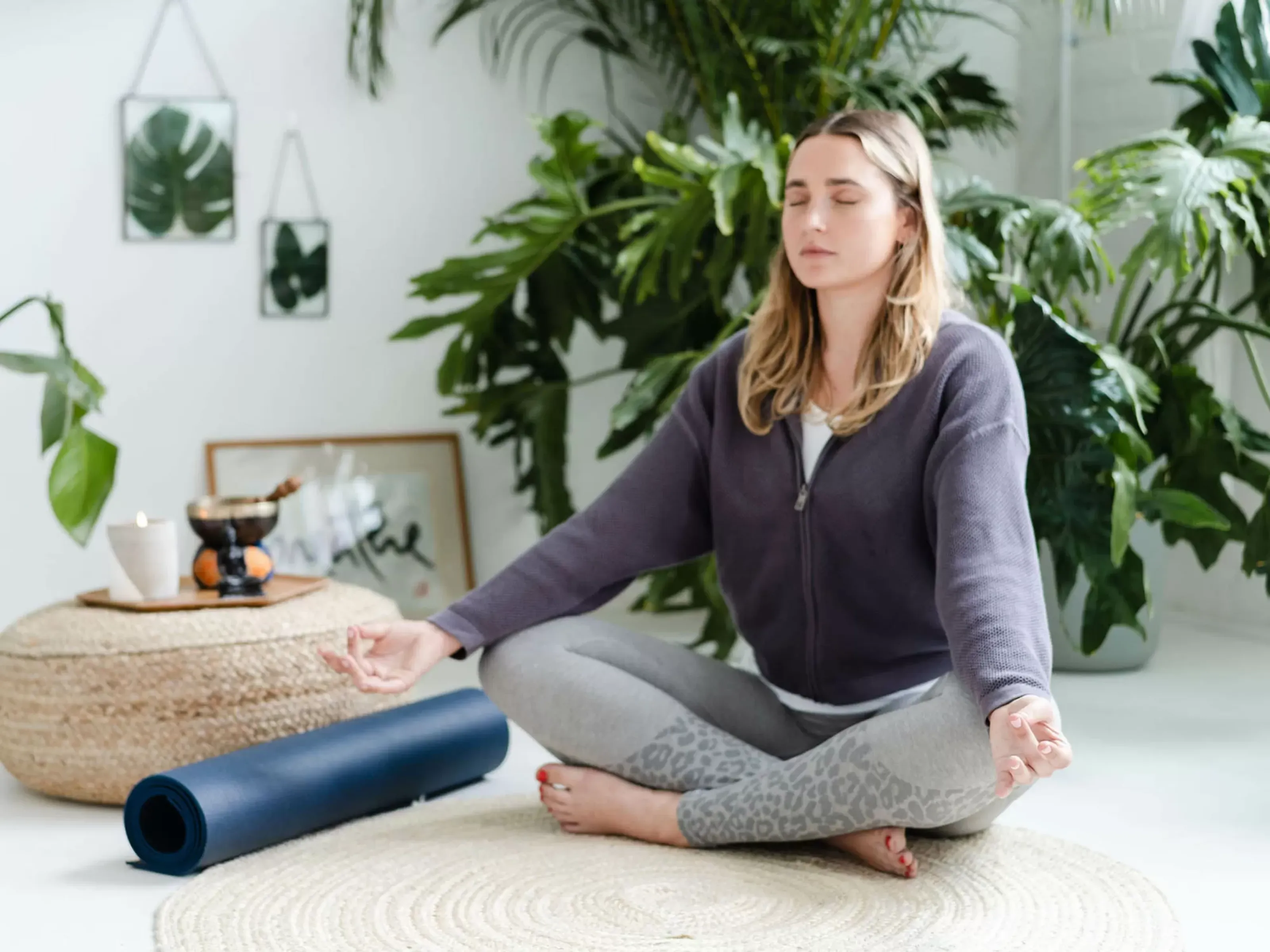 - A mix of mindfulness, meditation, breathing, stretches, and adaptable poses