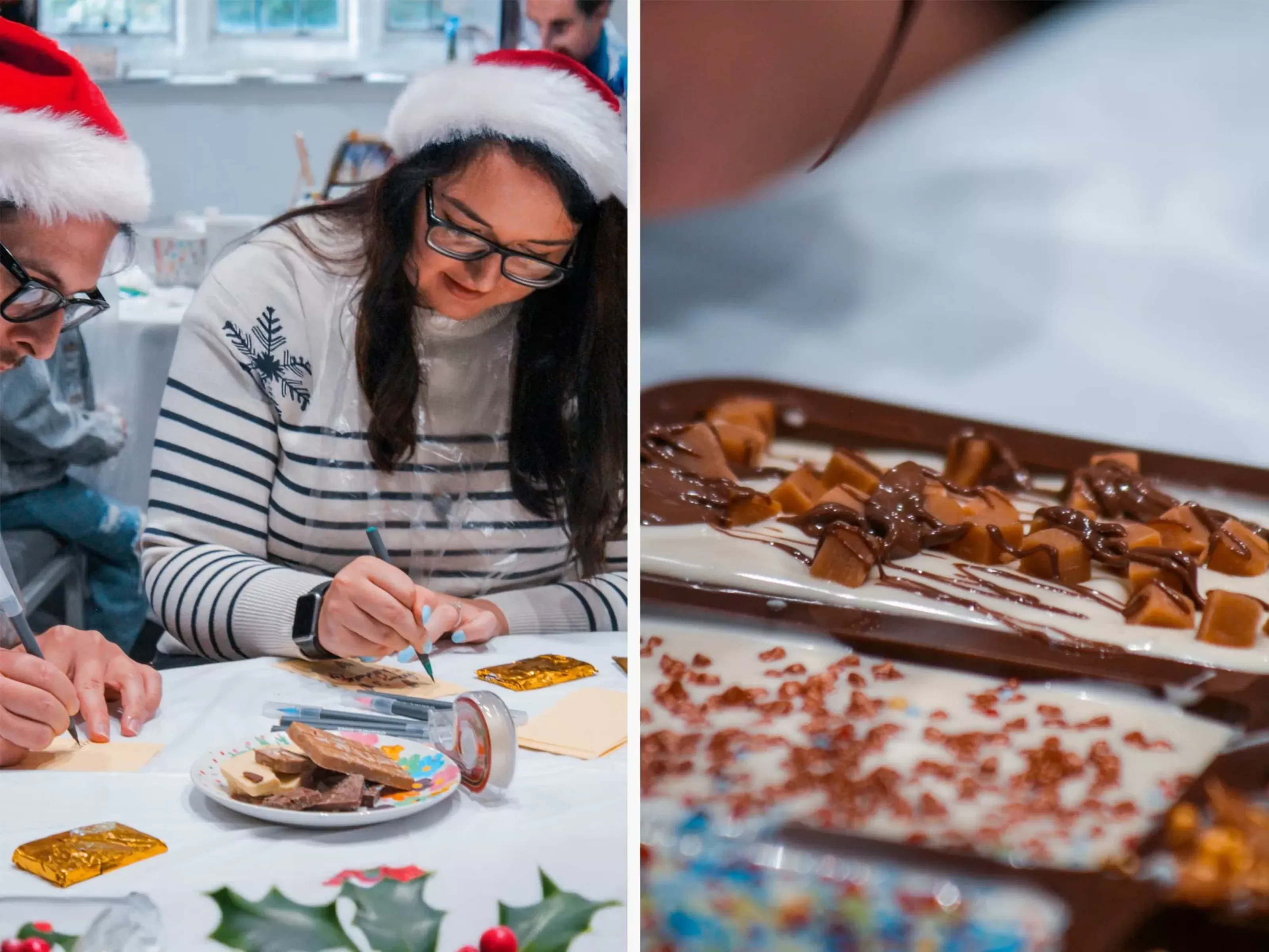 For the Christmas chocolate making experience, enjoy a festive chocolate-making workshop led by a friendly workshop leader, perfect for pairs to collaborate and create their own artisan chocolate bars and bites. Choose from dark, milk, or white chocolate, then pour and decorate your creations with seasonal toppings such as crushed candy canes, gingerbread pieces, and fudge. All while wearing a Santa hat and apron to keep the Christmas spirit alive. Once your chocolates have set, design and personalise your own packaging to take home or gift. This experience can take place at a city-centre venue or at your chosen location, with all materials provided. Sessions typically last up to two hours, depending on group size, making it a delightful and memorable festive activity