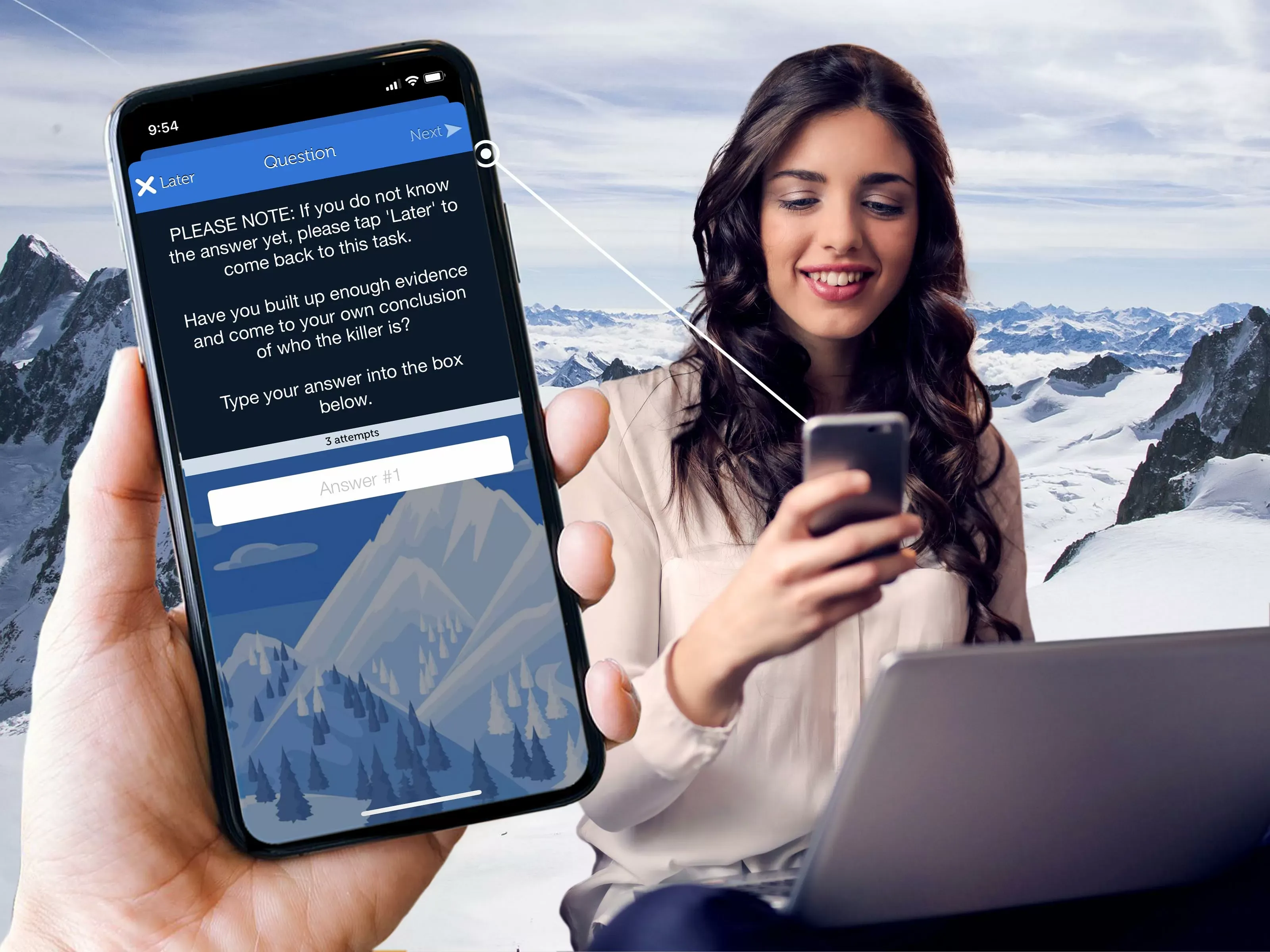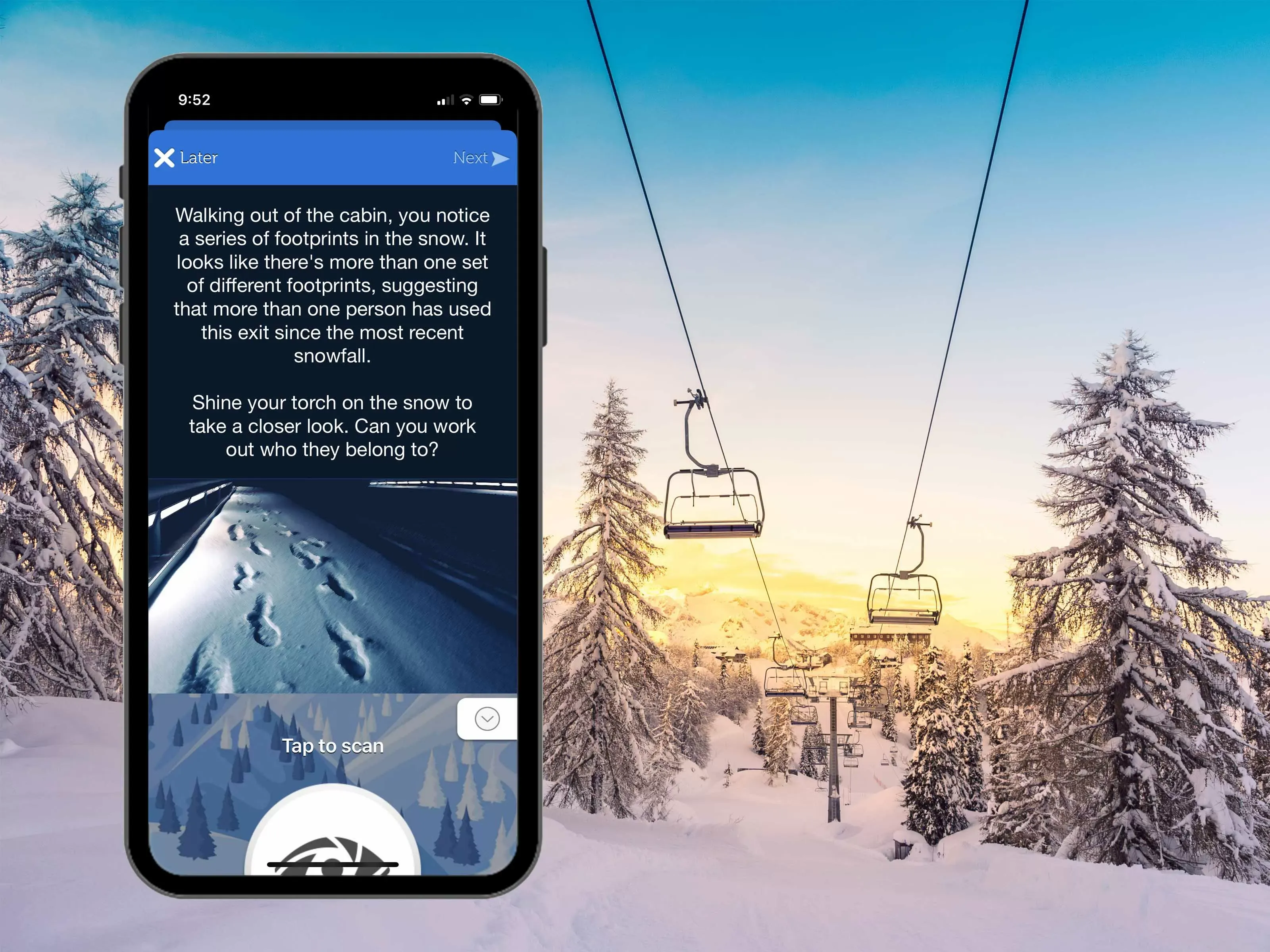 - Scour the chalet for evidence & talk to witnesses